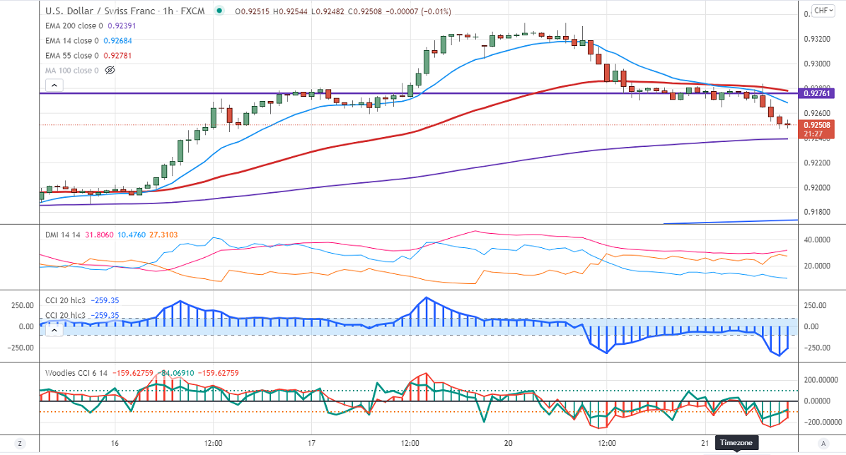 The pair has halted its three weeks of the bullish trend and shown a minor decline on board-based Swiss franc buying. Markets eye the US fed monetary policy for further direction. The US dollar index lost more than 30 pips from the minor top 93.45. At the time of writing, USDCHF is hovering around 0.92526 down -0.21%.