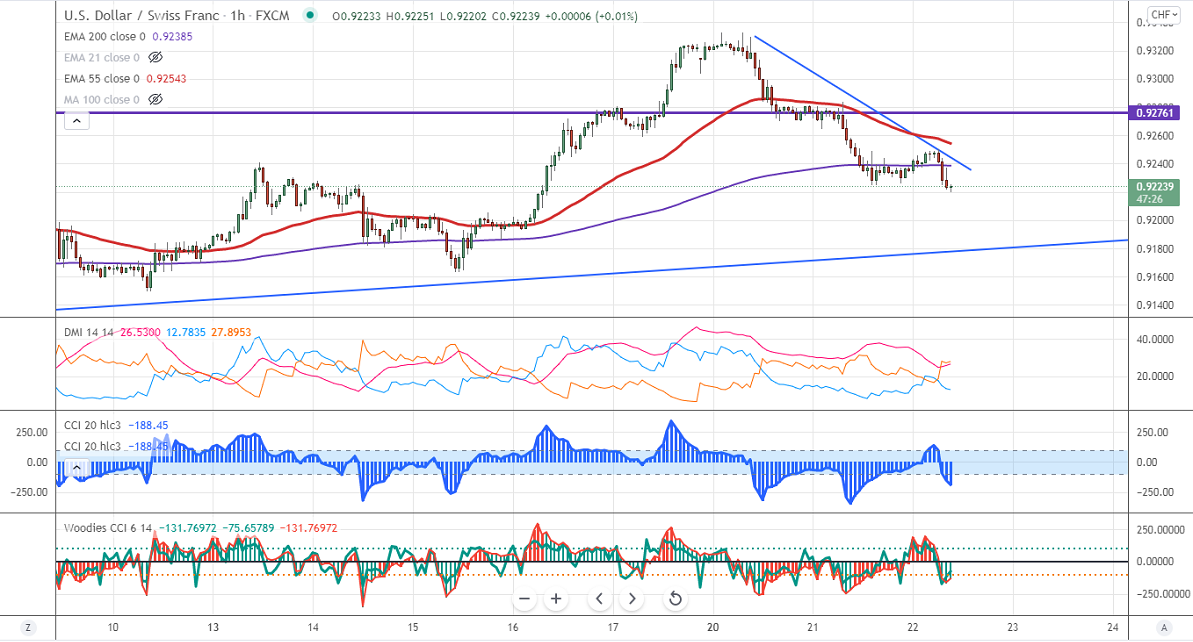 The pair continues to trade weak for the third consecutive days on US dollar weakness. The global financial market turmoil due to Chinese real estate developer Evergrande's debt crisis has increased demand for Safe-haven assets like the Swiss franc. Markets eye the US fed monetary policy for further direction. The US dollar index is trading flat. Any breach above 9+3.50 confirms further bullishness. At the time of writing, USDCHF is hovering around 0.92247down -0.11%.