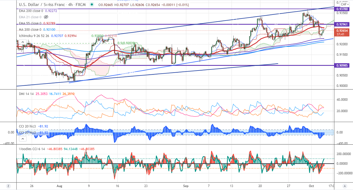 USDCHF is facing strong resistance around 0.92794 (55- 4H EMA). Any break above targets 0.9330/0.93685. It should surge past 0.9370 for further bullish continuation. A jump to 0.9400/0.94725 is possible. On the lower side, immediate support is around 0.92350. Any convincing breach below targets 0.92150/0.9180.