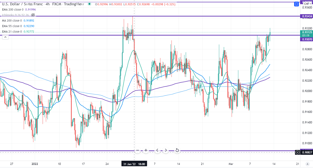 The pair gained more than 150 pips this week due to strength in the US dollar. The escalation of Russia and Ukraine has increased demand for safe-haven assets like the US dollar. The minor pullback in the US treasury also supported the pair at lower levels. USDCHF hits a high of 0.93207 at the time of writing and is currently trading around 0.93162.