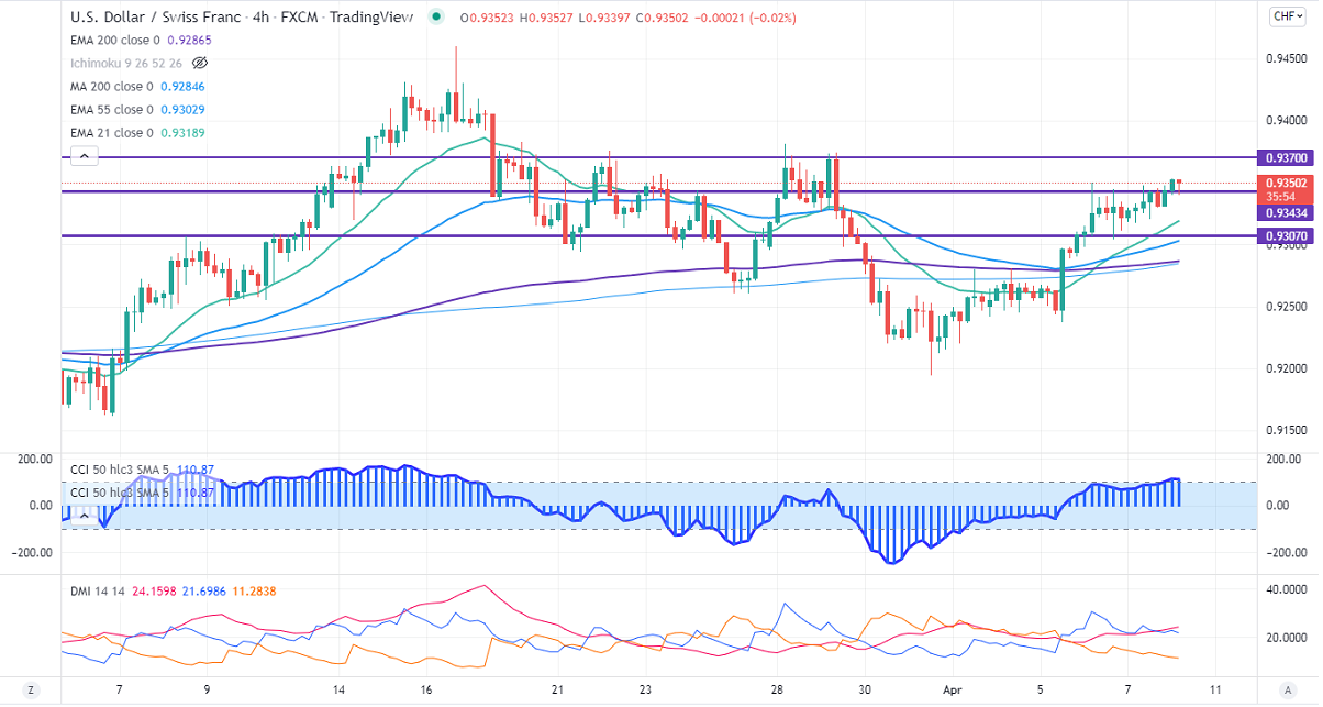 The pair consolidates after hitting five day high of 0.93532. It was one of the best performers this month and surged more than 100 pips on the hawkish Fed stance. 10-year US yield hits fresh year high after Brainard signals aggressive rate hikes. USDCHF hits an intraday high of 0.93532 and is currently trading around 0.93488.