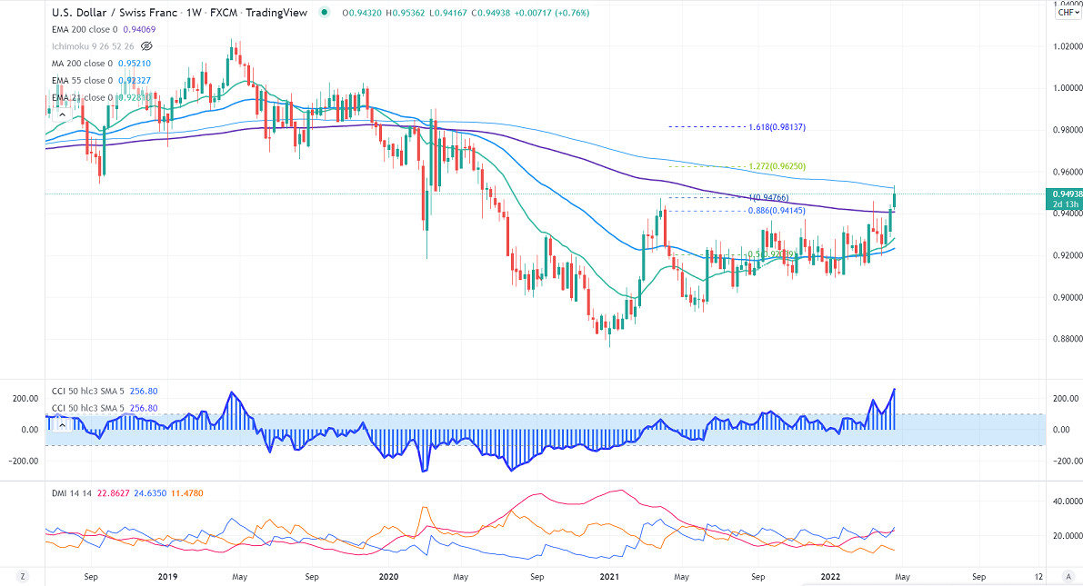 The pair trades higher for a third consecutive week and hits the highest level since Mar 2021. Hawkish comments from Fed officials have increased the chance of an aggressive rate hike by the fed. According to the CME Fed watch tool, the probability of a 50 bpbs rate hike in May increased to 93.2 % from 86% one week ago. USDCHF hits an intraday high of 0.95362 and is currently trading around 0.95009.