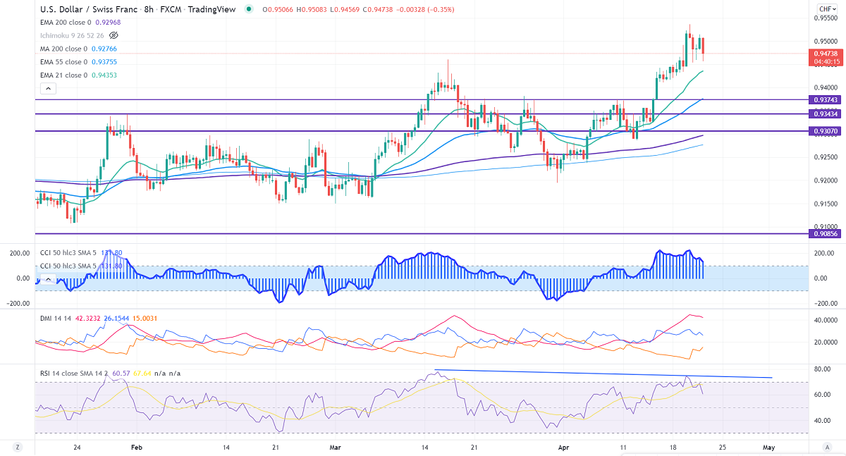 The pair has halted its one week of the bullish trend and shown a minor profit booking. It was one of the best performers this month and surged more than 250 pips. The dollar gained sharply in hopes of Fed aggressive rate hike and strong US treasury yields. According to the CME Fed watch tool, the probability of a 50 bpbs rate hike in May increased to 95.4 % from 90.4% one week ago. USDCHF hits an intraday high of 0.94658 and is currently trading around 0.94761.