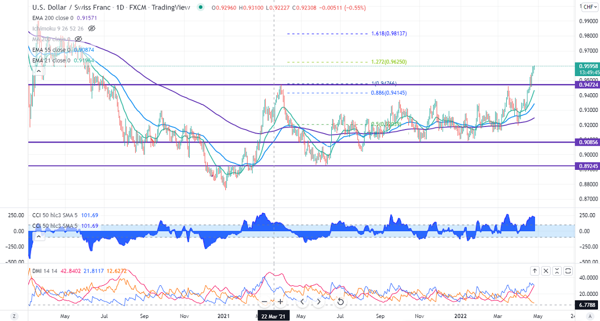 The pair gained after a minor pullback to 0.9540 on board-based US dollar buying. The surge in inflation and hawkish comments from fed chairman Powell support the US dollar. According to the Fed watch tool, the probability for a 50 bpbs rate hike in May has increased to 97.6% from 89.3% a week ago. USDCHF hits an intraday high of 0.95995 and is currently trading around 0.95975.