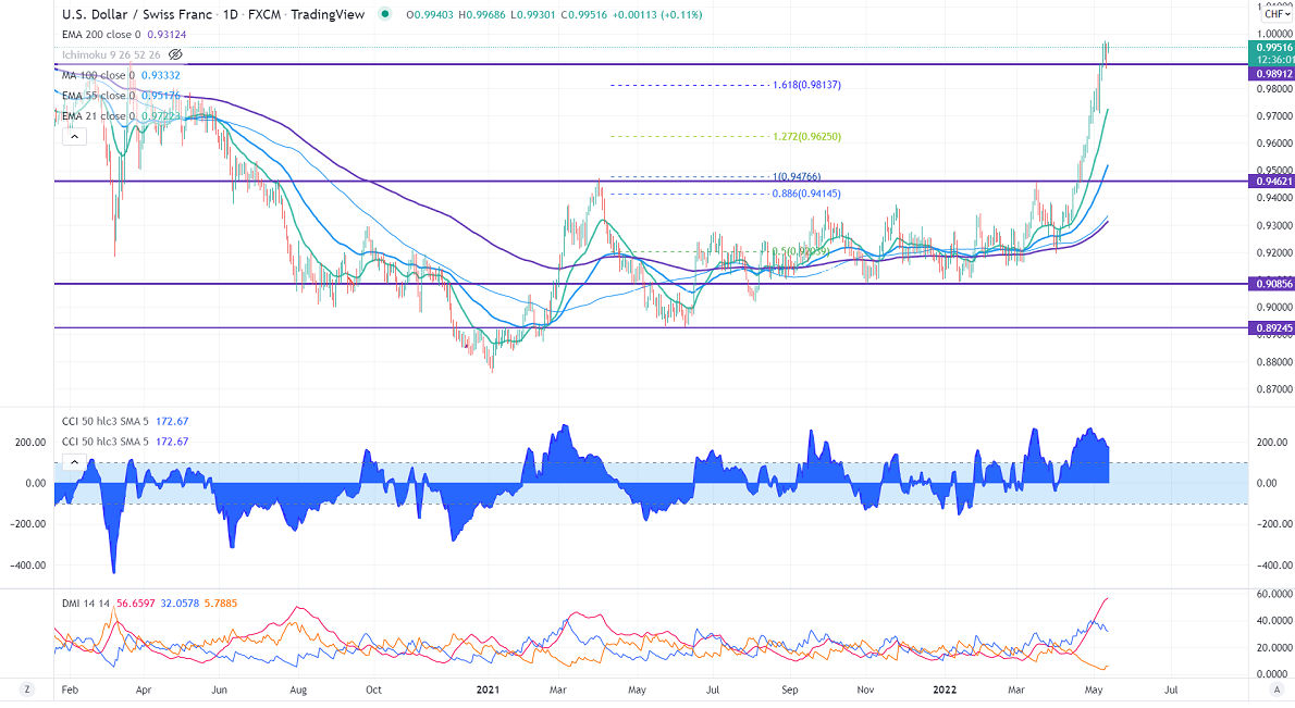 The pair regained above 0.9950 on board-based US dollar buying. According to the CME Fed watch tool, the probability of a 50 bpbs rate hike rose to 93.3% from 86.4% a week ago.US CPI cools off to 8.3% from March's 40-year high of 8.5%. The inflation is better than the forecast of 8.1%. USDCHF hits an intraday high of 0.99686 and is currently trading around 0.99625.