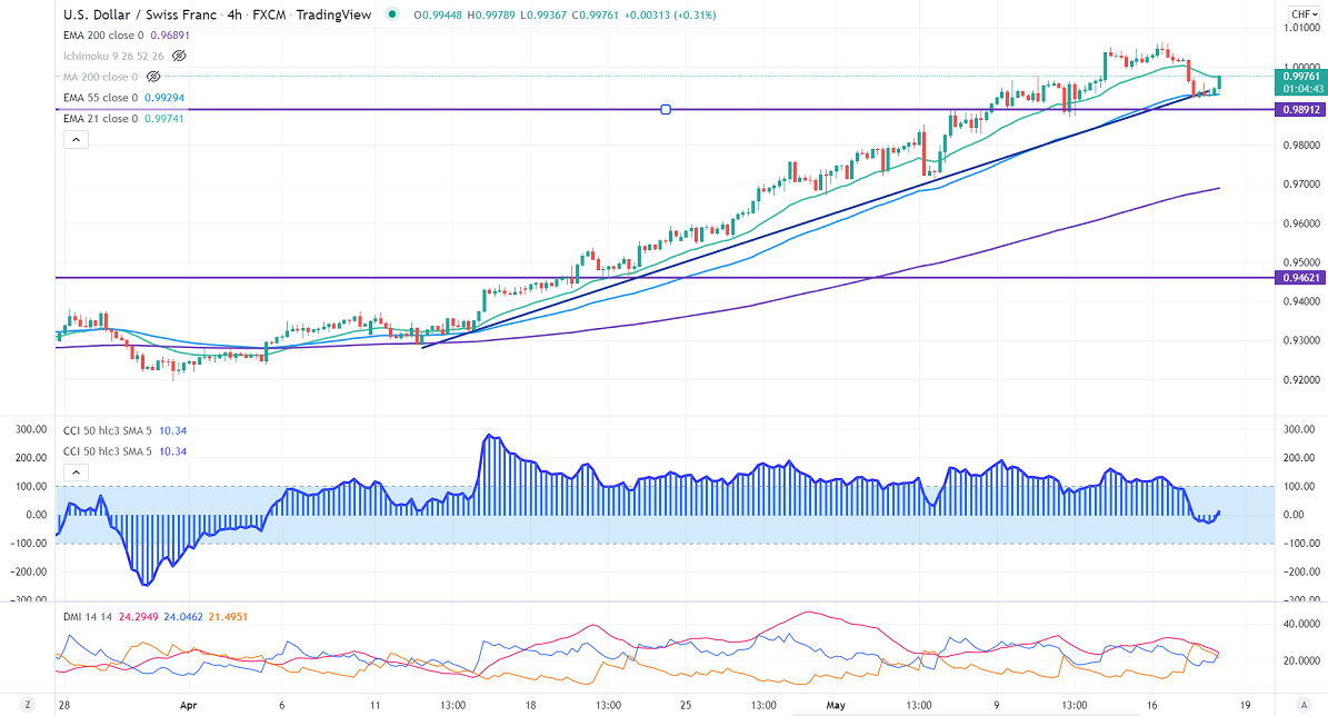 The pair pared gains made the previous week on US dollar profit booking. US dollar gained after Fed chairman comments. He said that the Central bank plans to be more aggressive if inflation pressure continues. US retail sales rose by 0.9% in Apr compared to 1%. Core sales jumped 0.6% vs. the Estimate of 0.4%. According to the CME Fed watch tool, the probability of a 50 bpbs rate hike rose to 90.5% from 86.2 a day ago.g 2011.USDCHF hits a high of 1.00492 and is currently trading around 1.00535.