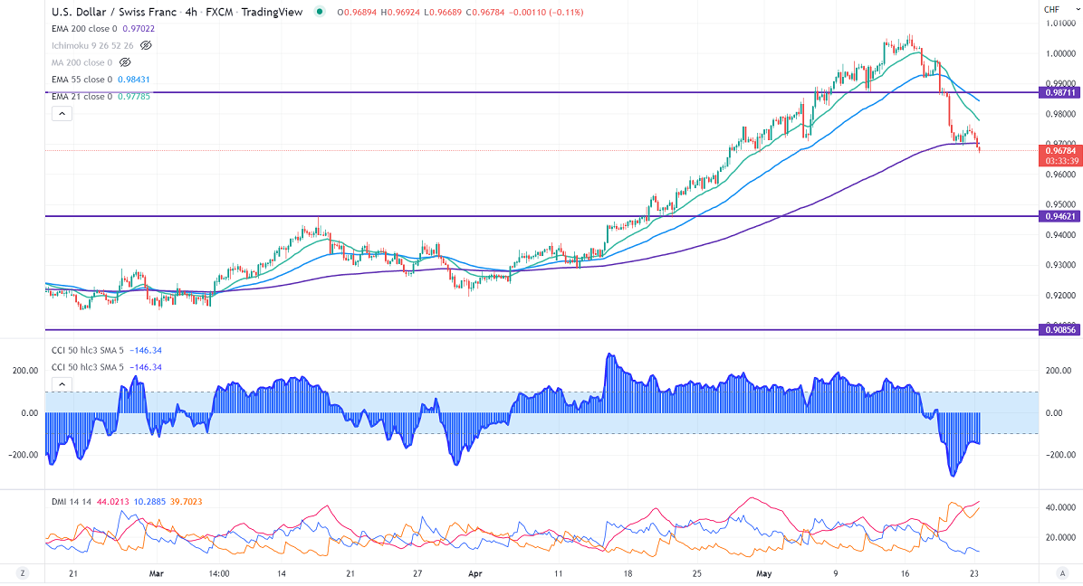 The pair is trading weak for a second consecutive week and declined more than 300 pips. The Swiss franc performed well against all majors the previous week after SNB chairman Jordan said that the central bank was ready to take action if inflation increased sharply. According to the CME Fed watch tool, the probability of a 50 bpbs rate hike dropped to 91.50% from 94.90% a day ago.USDCHF hits an intraday low of 0.96651 and is currently trading around 0.96642