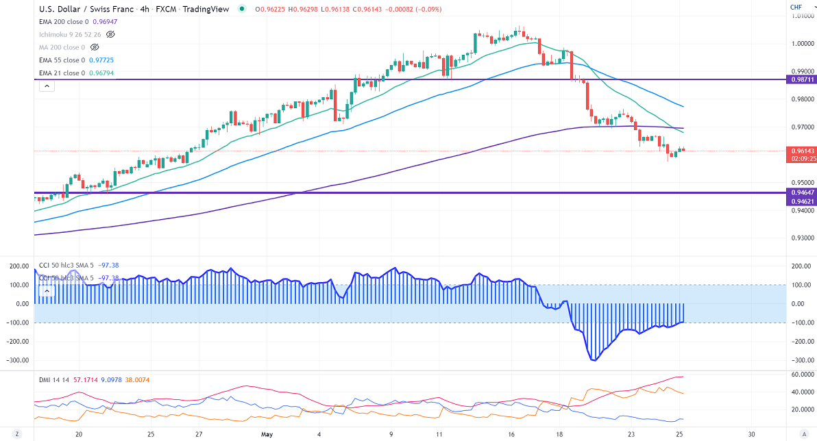 USDCHF hits a low of 0.95750 and is currently trading around 0.96177.