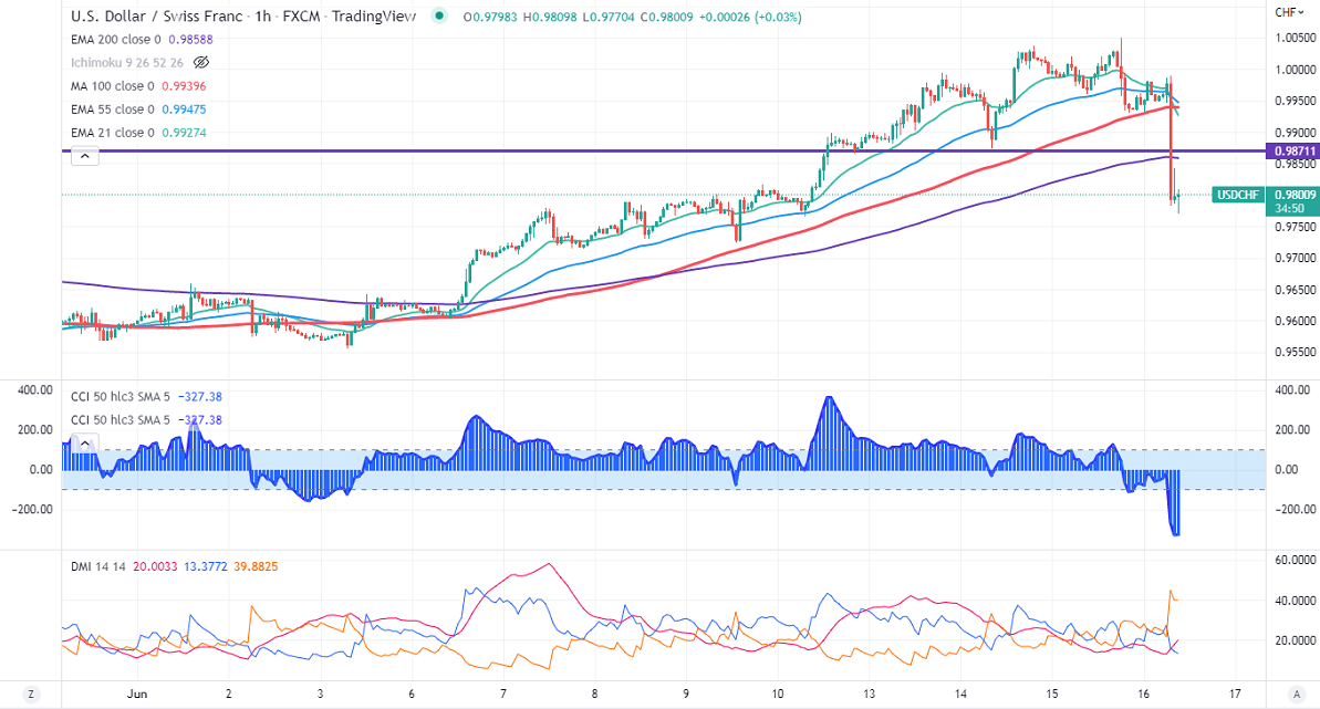 USDCHF formed a double top around 1.0060 and showed a massive sell-off after SNB monetary policy. The central bank hiked rates by 50bpbs to -0.25% for the first time since 2007. They have also said further monetary tightening will take place to tackle inflation. Technically in the hourly chart, the pair is holding below the short-term (21- and 55 EMA) and long-term moving average of 200 EMA (0.9860). Any close below 1.2780 confirms intraday bearishness. A dip to 1.2700/1.2660 is possible. USDCHF hits an intraday low of 0.97835 and is currently trading around 0.9835.