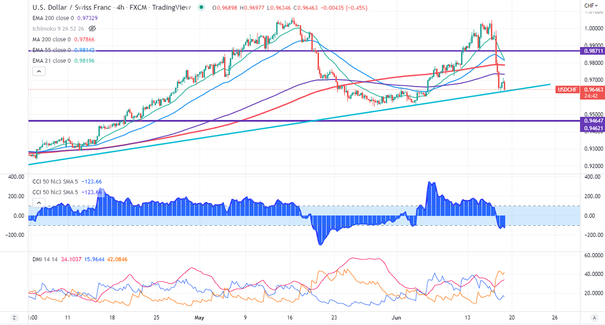 USDCHF declined drastically and lost more than 350 pips after a surprise rate hike by SNB. It hiked rates by 50bpbs and confirmed that the central bank will take necessary actions if inflation surged. Technically in the 4-hour chart, the pair is holding below the short-term (21- and 55 EMA) and long-term moving average of 200 EMA (0.97870). Any close below 0.9600 confirms intraday bearishness. A dip to 0.9550/0.9500 is possible. USDCHF hits an intraday low of 0.96345 and is currently trading around 0.96485.