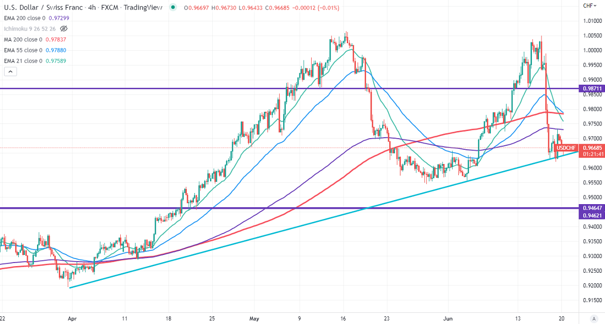 USDCHF continues to trade lower after a minor jump above 0.9700. The Swiss franc performed very well against all majors as Swiss National Bank hiked rates surprisingly by 50bpbs. Technically in the 4-hour chart, the pair is holding below the short-term (21- and 55 EMA) and long-term moving average of 200 EMA (0.97870). Any close below 0.9600 confirms intraday bearishness. A dip to 0.9550/0.9500 is possible. USDCHF hits an intraday low of 0.96433 and is currently trading around 0.96722.