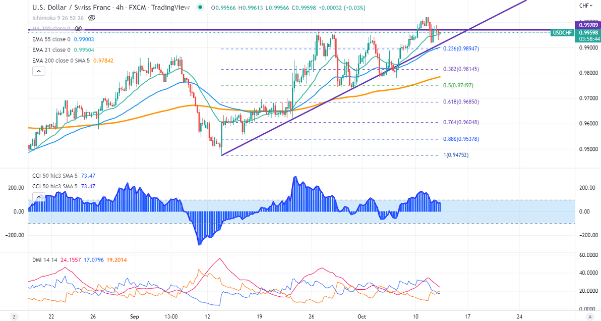 Technically in the 4-hour chart, the pair is holding above short-term (21- and 55 EMA) and 200 EMA (0.97823). Any break below 0.9900 will take the pair to 0.98490/0.780. USDCHF had an intraday low of 0.9930 and is currently trading around 0.99512.