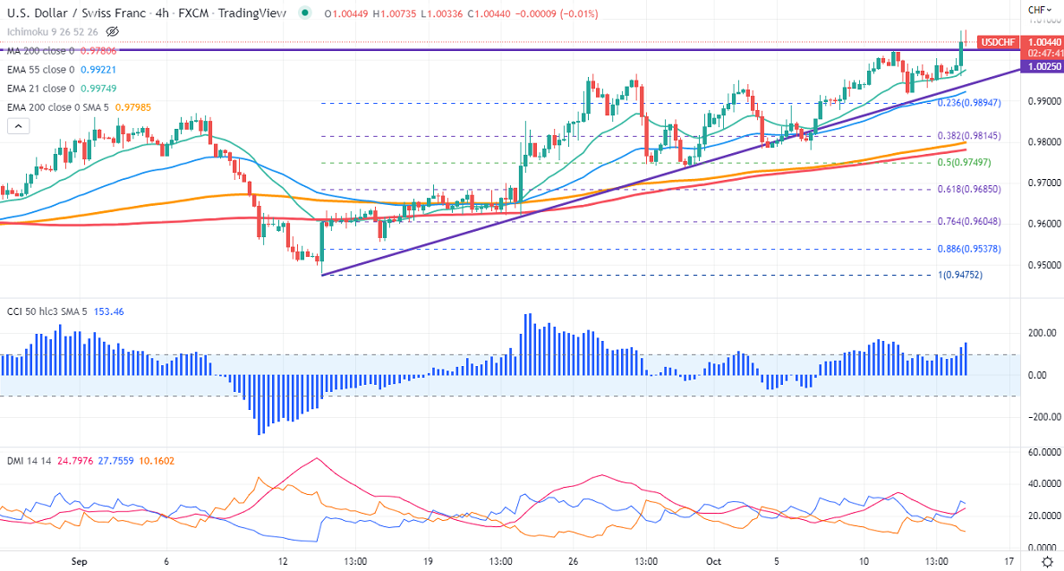 Technically in the 4-hour chart, the pair is holding above short-term (21- and 55 EMA) and 200 EMA (0.97728). Any break below 1.0020 will take the pair to 1/0.9960/0.9900. USDCHF had an intraday high of 1.00735 and is currently trading around 1.00349.