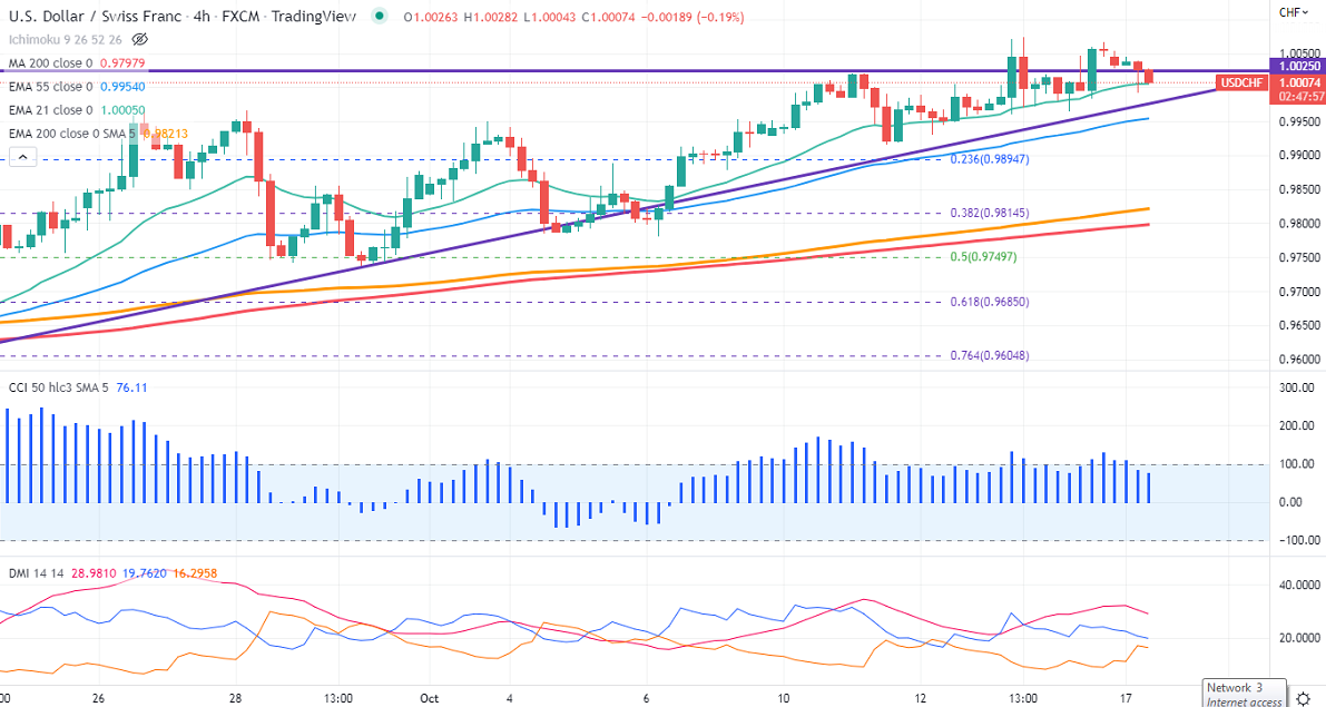 Technically in the 4-hour chart, the pair is holding above short-term (21- and 55 EMA) and 200 EMA (0.97728). Any break below 1 will take the pair to 0.9960/0.9900. USDCHF had an intraday low of 0.99921 and is currently trading around 1.00232.