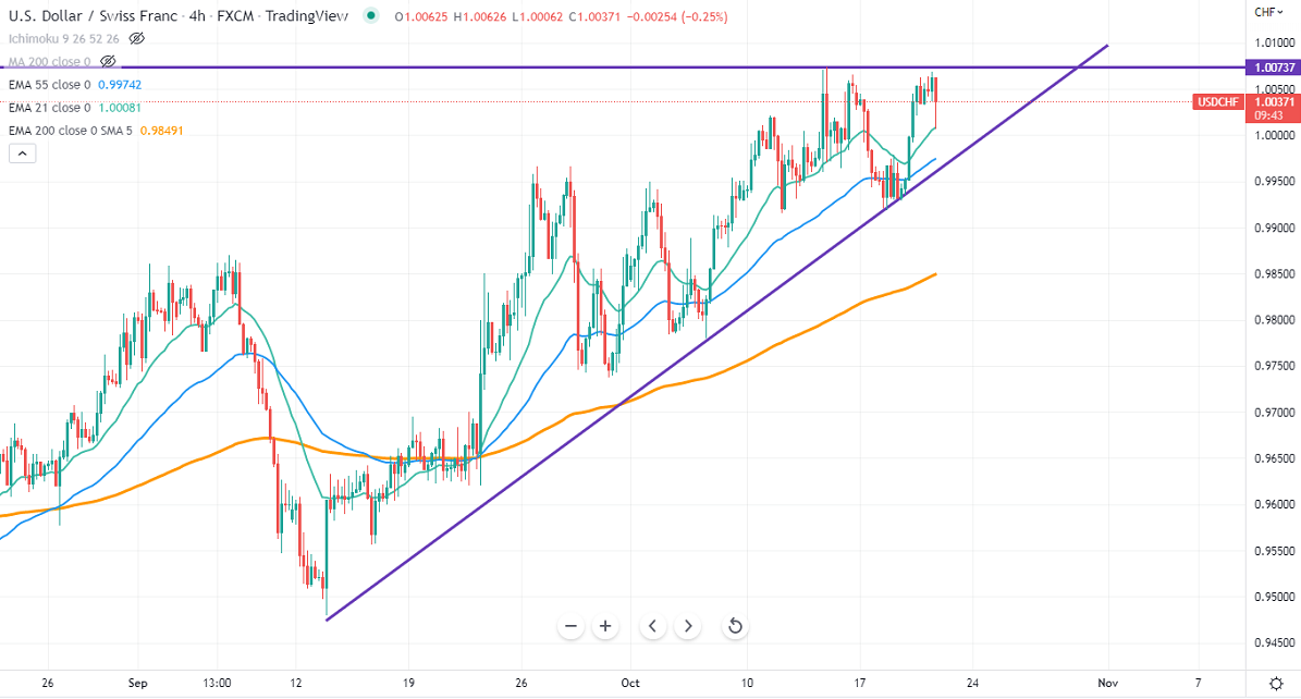 USDCHF has formed a double top around 1.0070 and shown a minor decline due to profit booking. The pair trades in a narrow range between 1.0708 and 0.99185 for the past week. The number of people who have filed for unemployment benefits in the week ending Oct 15 dropped to 214K compared to a forecast of 229k. US Philly fed manufacturing index declined to -8.7 in Oct vs. -5 estimate.US 10-year yield hits fresh 14-year high in hopes of another two 75 bpbs rate hikes by the fed this year. The US 10 and 2-year spread narrowed to -44 basis points from -57 bpbs.