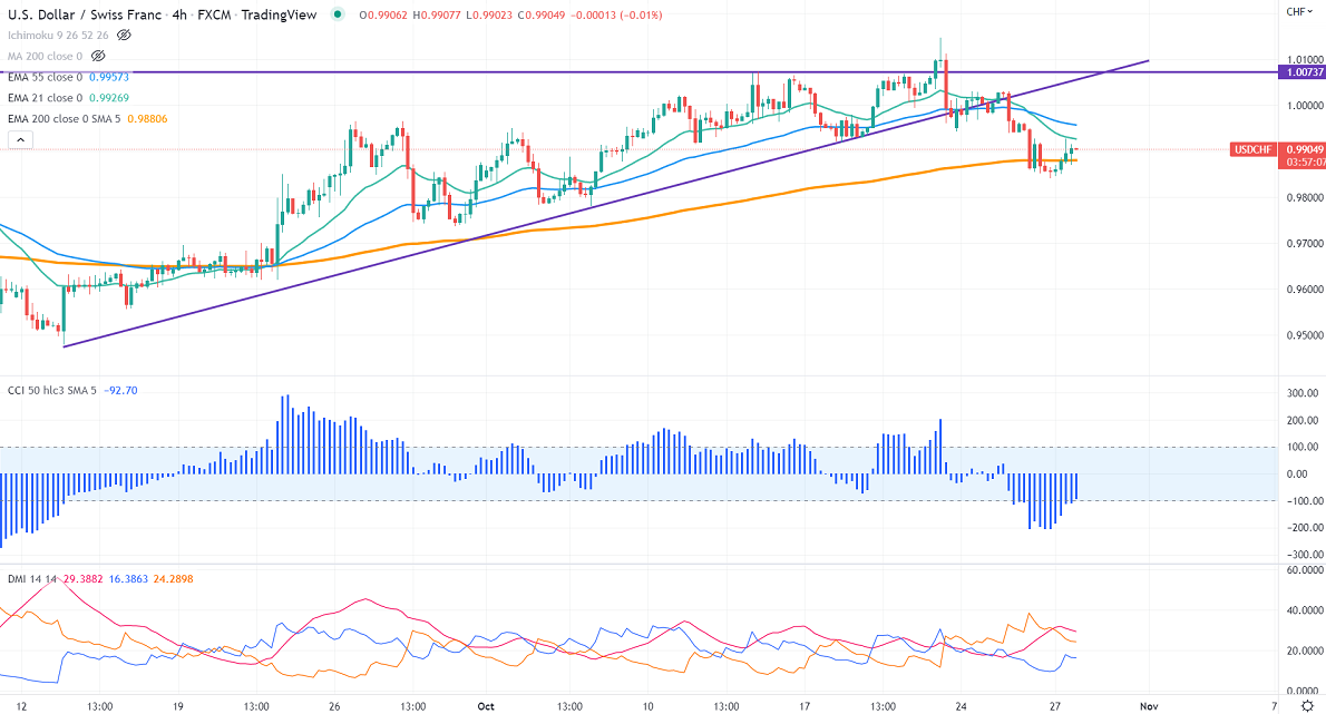 Technically in the 4-hour chart, the pair is holding below short-term (21 and 55 EMA) and above long-term 200 EMA (0.98803). Any break below 0.9840 confirms further bearishness, a dip to 0.9780/0.9720 is possible. It hits an intraday high of 0.99272 and is currently trading around 0.98618.