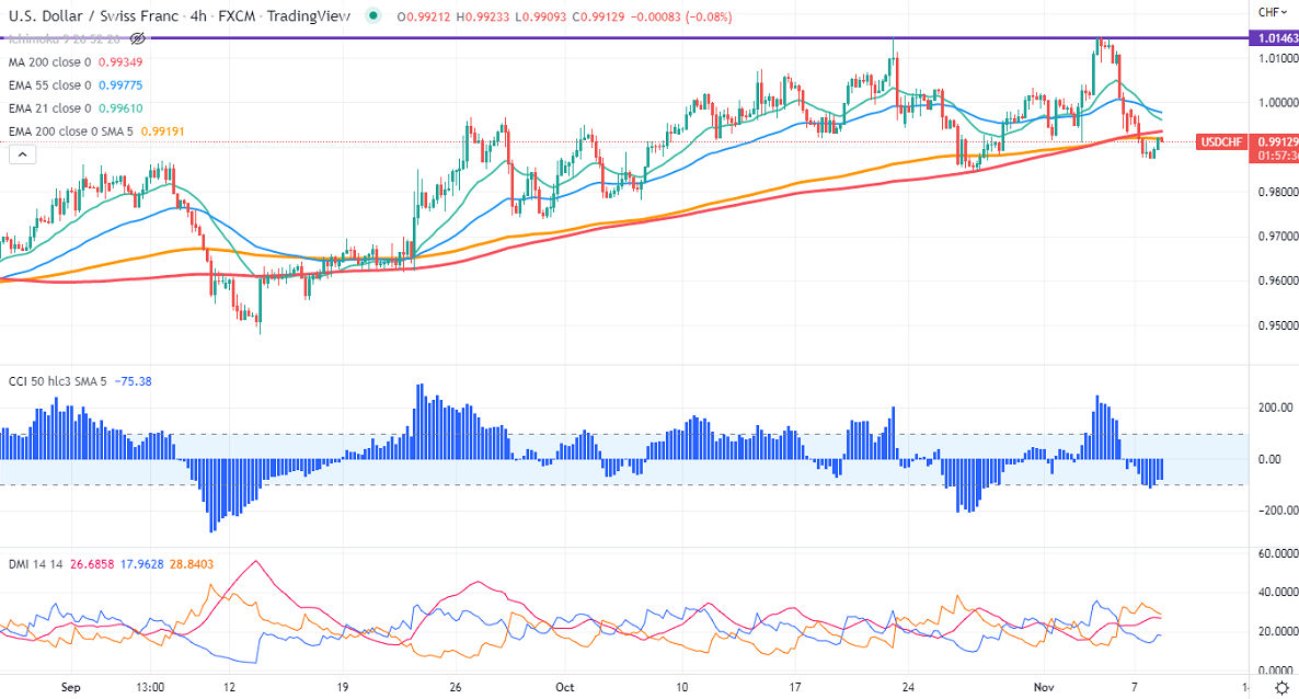Technically in the 4-hour chart, the pair is holding below short-term (21 and 55 EMA) and above long-term 200 EMA (0.99205). Any break below 0.9870 confirms further bearishness; a dip to 0.9840/0.9800 is possible.