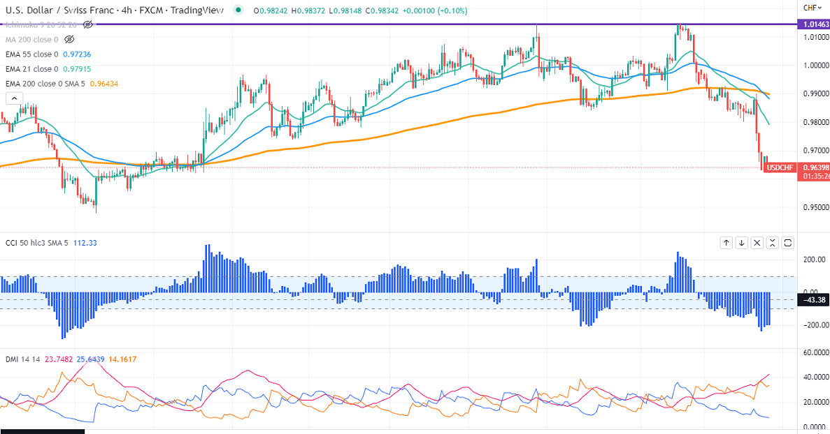 Technically in the 4-hour chart, the pair is holding below short-term (21 and 55 EMA) and long-term 200 EMA (0.99119). Any break below 0.9580 confirms further bearishness; a dip to 0.9528/0.9470 is possible.