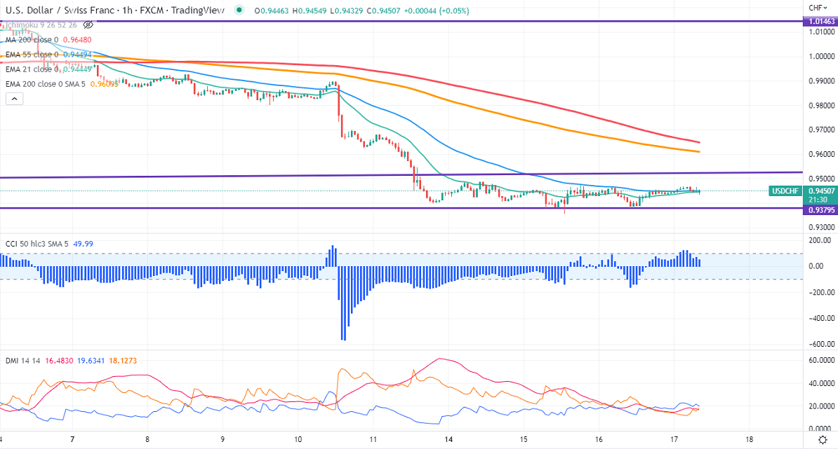 Technically in the hourly chart, the pair is holding above short-term (21 EMA), below 55 EMA, and long-term 200 EMA (0.96110). Any break below 0.9375 confirms further bearishness; a dip to 0.9300/0.9195 is possible.