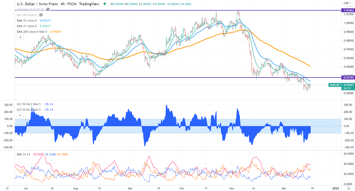 USDCHF showed a minor pullback after the SNB rate hike. The central bank increased rates by 50 bpbs to 1% in line with the estimate. Swiss inflation surged to 3% in Nov, much below the Eurozone CPI of 10%. Markets anticipate a slow pace of further rate hikes by SNB. It hits an intraday low of 0.9250 and is currently trading around 0.92775.