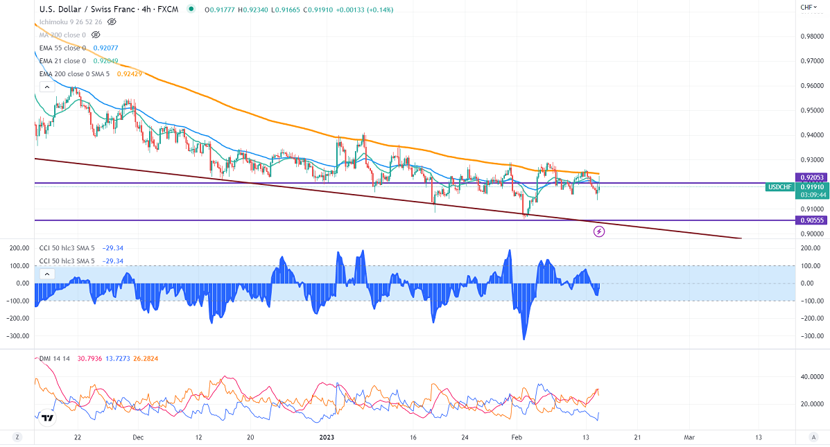 USDCHF showed a nice pullback after the US CPI data. The yearly inflation declined to 6.4%, slightly above the forecast of 6.4%. Month on Month on Month, CPI was 0.50%, compared to an estimate of 0.40%. It hits an intraday low of 0.91360 and is currently trading around 0.91980.