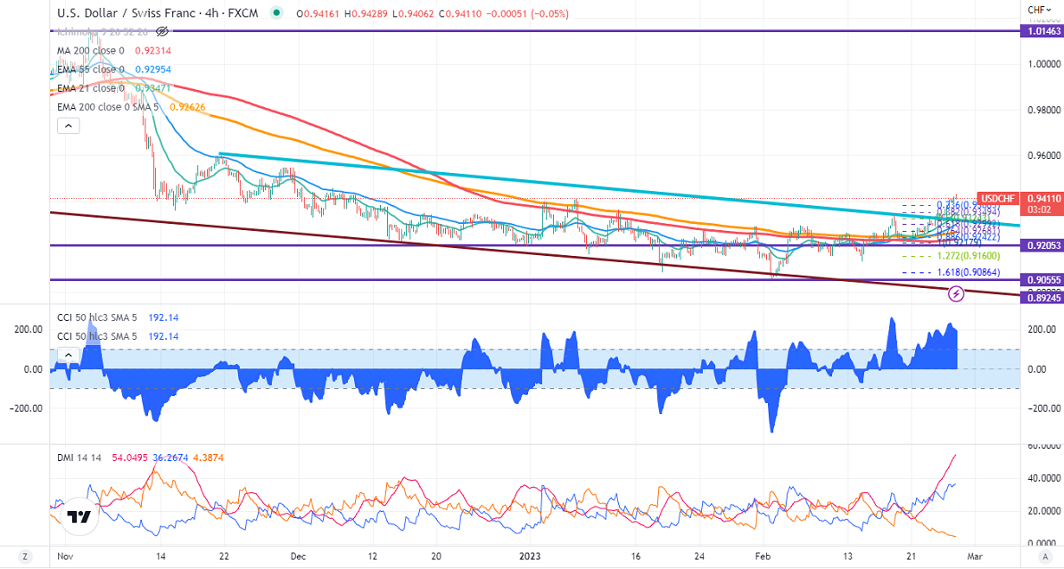 USDCHF trades higher for consecutive days and hits high on board-based US dollar buying. The pair gained momentum after hawkish FOMC meeting minutes. US PCE data came above estimates and also pushed USDCHF further higher. US Personal Consumption Expenditure YoY increases to 4.7% in Jan vs. forecast of 4.3%. It hits an intraday high of 0.94289 and is currently trading around 0.94197.