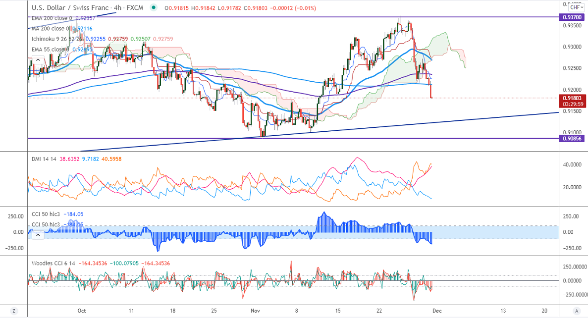 The pair traded weak for the third consecutive day and lost more than 150 pips. The spread of corona variant Omicron has increased demand for safe-haven assets like the Swiss franc and yen. The global stock markets tumbled after Moderna CEO warns that vaccines will be less effective against Omicron. The US 01-year yield declined more than 5% also putting pressure on the US dollar. It hits an intraday low of 0.91780 and is currently trading around 0.91806.