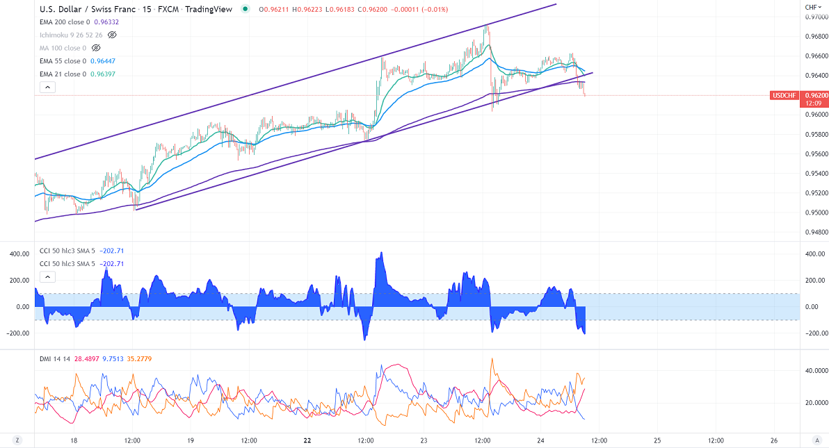 200 EMA (0.96335). Any break above 0.96625 will take the pair to 0.9700/0.9765/0.9800. USDCHF hits an intraday low of 0.96250 and is currently trading around 0.96264.