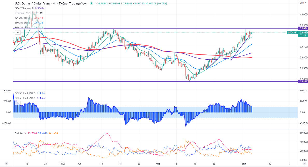Technically in the 4-hour chart, the pair is holding above short term (21- and 55 EMA) and 200 EMA (0.96425). Any break below 0.9780 will take the pair to 0.970/0.9660. USDCHF hits an intraday high of 0.98362 and is currently trading around 0.98285.