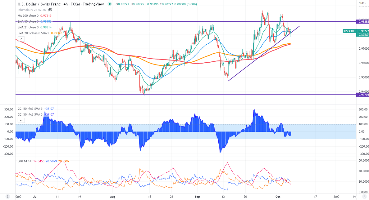 Technically in the 4-hour chart, the pair is holding below short term (21- and 55 EMA) and above 200 EMA (0.97359). Any break below 0.9780 will take the pair to 0.97300/0.9660. USDCHF hits an intraday low of 0.97805 and is currently trading around 0.98158.