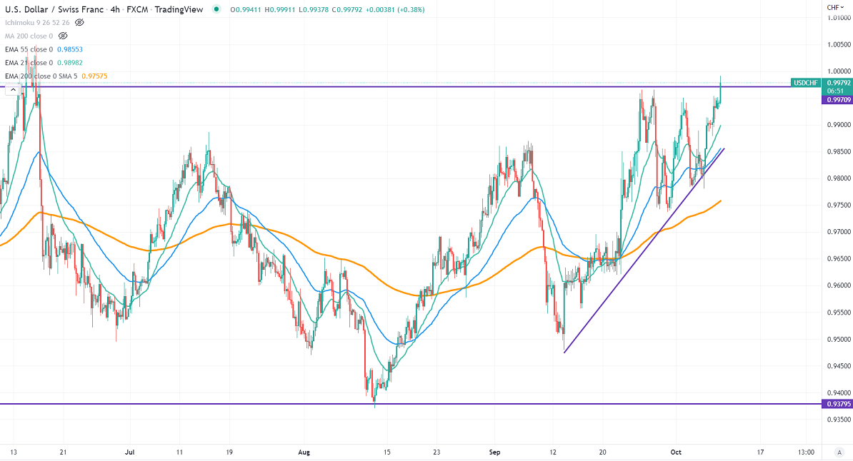 USDCHF breaks significant resistance 0.99685 on board-based US dollar buying. DXY gained momentum after upbeat US NFP data. The US economy has added 263K jobs in Sep compared to a forecast of 265000. The unemployment rate dropped to 3.5% vs3.7% the previous month.