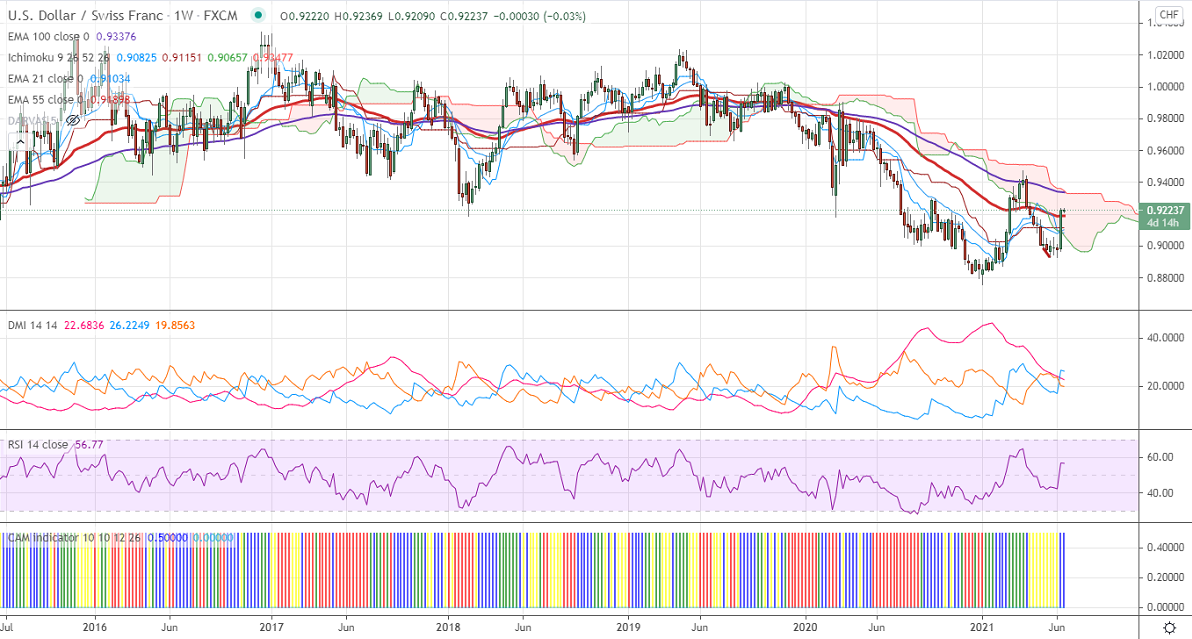 The pair is holding above weekly Kijun-Sen, Tenken-Sen, and the cloud. The near-term resistance is around 0.92500. Any indicative break above will take the pair to next level to 0.9300/0.9340. On the lower side, near-term support is around 0.9180. Any convincing breach below targets 0.9120/0.9080. Significant selling will happen only if it breaks 0.8920.