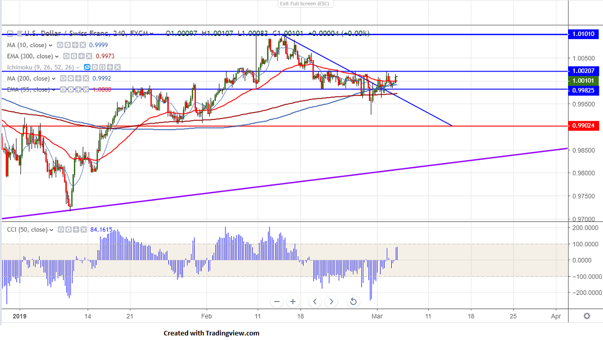 USDCHF is consolidating after a good recovery of more than 90 pips after a more than 110 pips decline from temporary top 1.010.The slight weakness in Swiss franc is due to easing US-China trade war.But Brexit uncertainty is factor to be watched. It is currently trading around 1.00130.