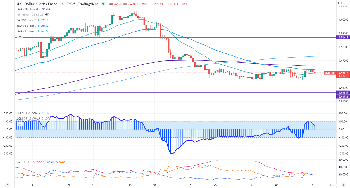 The pair gained strength after upbeat US jobs data. The economy has added 390000 jobs in May compared to a forecast of 325K. The US 10-year yield surged above 2.95% on an optimist US Nonfarm payroll. According to the CME Fed watch tool, the probability of a 50 bpbs rate hike in Jul increased to 89.5% from 88.6% a day ago. USDCHF hits a low of 0.96112 and is currently trading around 0.96125.