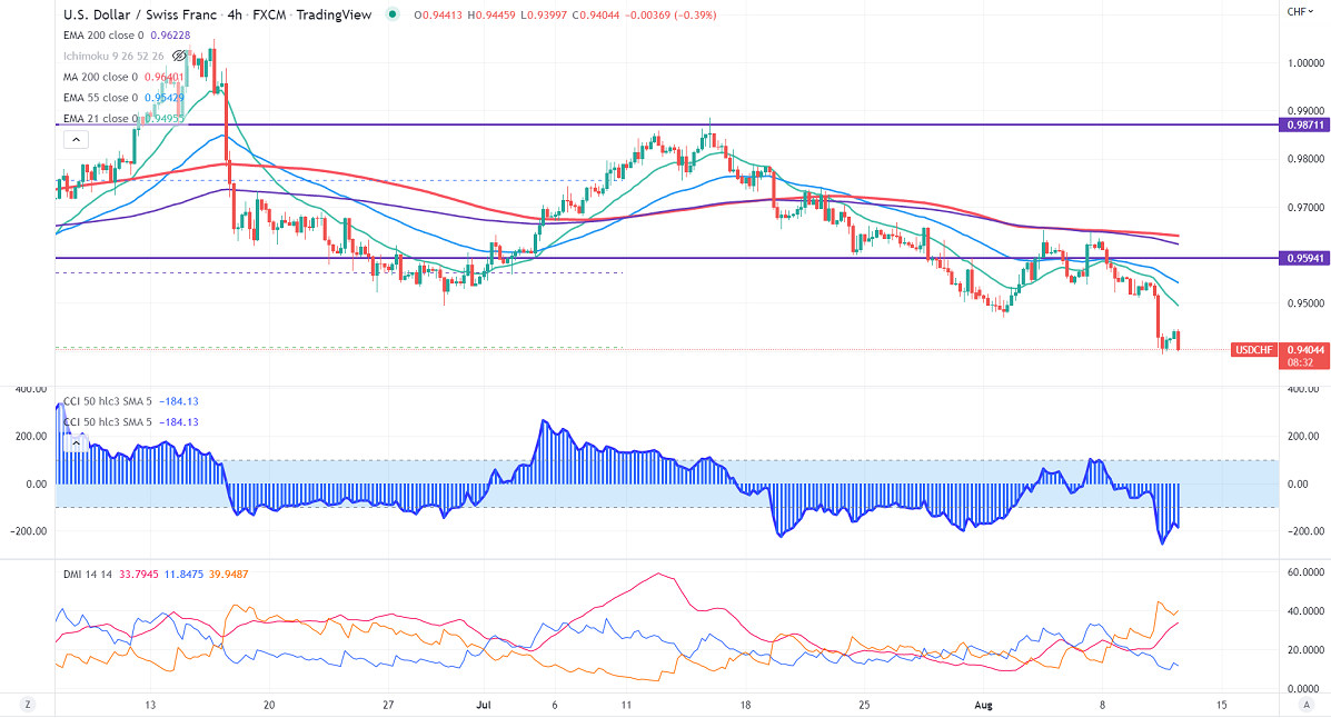 The pair tumbled sharply after dismal US inflation data. US inflation slowed from 9.1% YOY to 8.5% YoY, below expectations of 8.7%. The demand for safe-haven assets like the Swiss franc increased due to geopolitical tension between China and Taiwan alos putting pressure on the pair at higher levels. USDCHF hits a low of 0.93933 and is currently trading around 0.94047.
