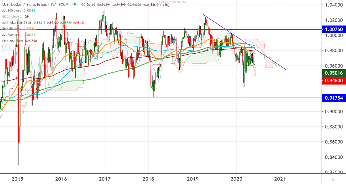 In the Weekly chart, the pair is holding well below 200 and 100 W MA. It has broken major support at 0.9500, a dip till 0.9435/0.9400.