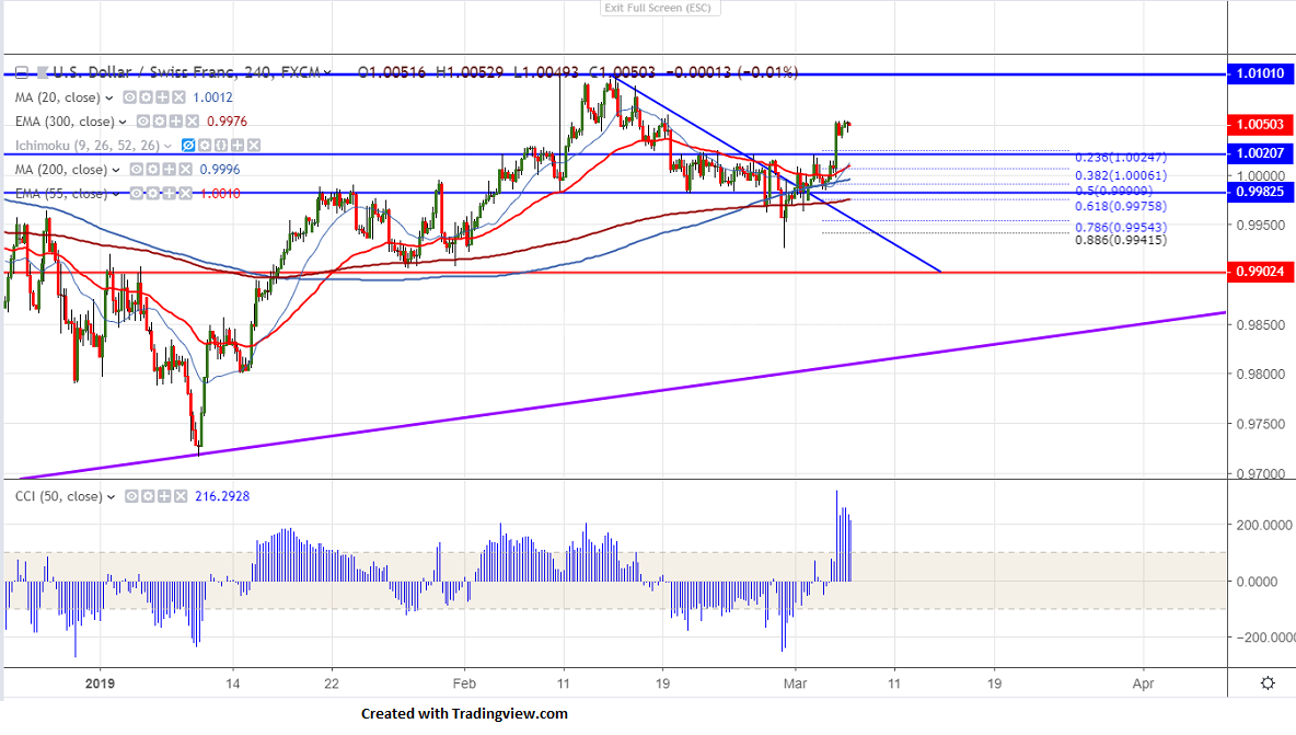USDCHF has broken major resistance 1.0020 after a long consolidation.The pair was consolidating in narrow range between 1.0020 and 0.9980 for past three trading day.Swiss franc gained sharply after hitting low of 1.0100 level on Brexit uncertainty.It hits low of 0.99264 on Feb 28th 2019 and is currently trading around 1.00130.