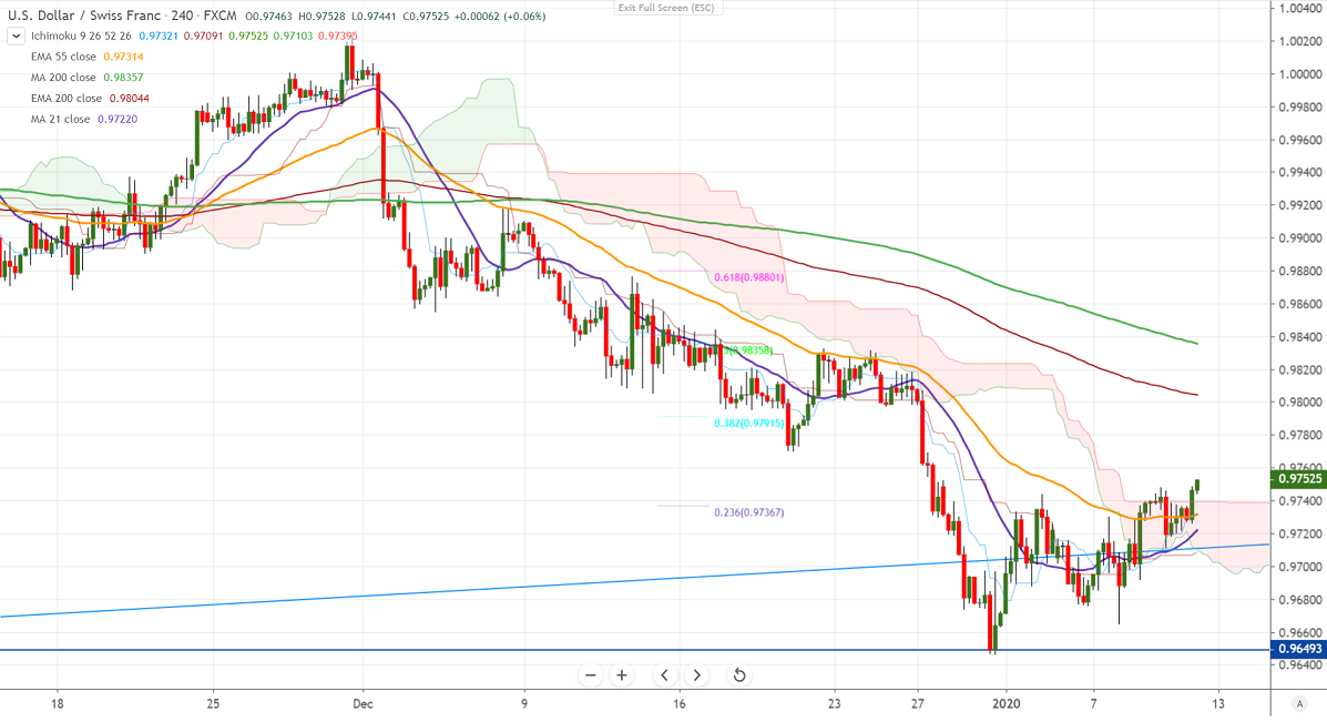 USDCHF recovers slightly after showing a minor dip till 0.97114 yesterday. The demand for Safe-haven assets is decreasing as the US and China sign phase one trade deal by Jan 15th and de-escalation of tensions between the US and Iran. It is currently trading around 0.97397. Markets eye US Non-farm-payroll data for further direction.