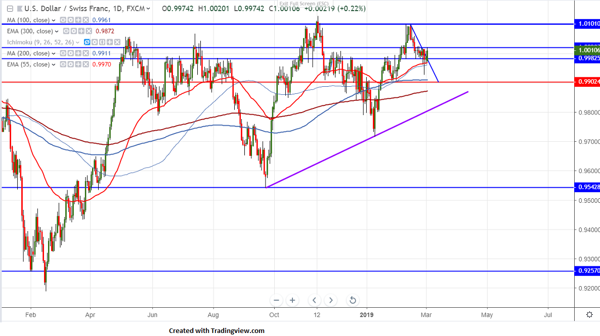 USDCHF has halted its 2-week of bearish trend and jumped more than 90 pips form low of 0.99265 made on Friday.The pair has formed temporary top around 1.0100 and shown a decline of more than 150 pips on ongoing global uncertainty. It is currently trading around 1.00130.