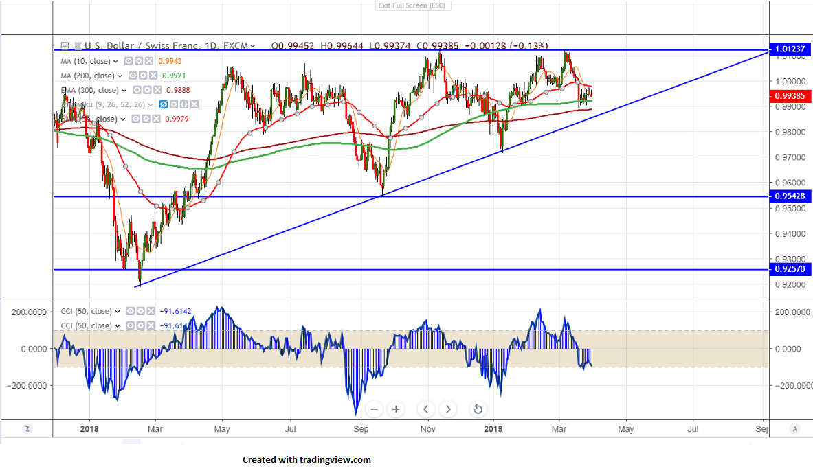 USDCHF is trading in sideways for past 1 week and trading below parity level.The pair is struggling to clear break out above 0.9975 in past two trading day. US dollar was trading higher on declining US 10 year yield and yield inversion. It has jumped nearly 90 pips in previous week and any break above 97.40 confirms further bullishness.But Brexit uncertainty is supporting safe haven demand currency such as Yen,Swiss franc etc. Markets eye US retail sales and US ISM manufacturing data for further direction. The pair has formed temporary top around 1.01245 and is currently trading around 0.99425.