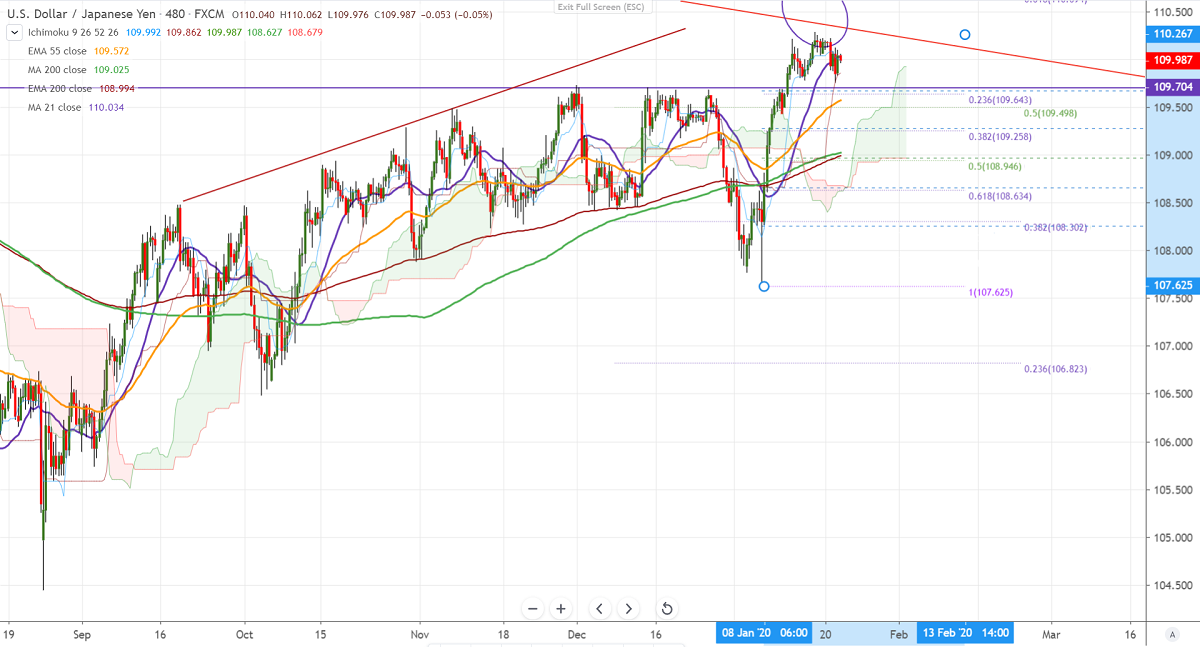 USDJPY has halted its 2-week of the bullish trend and lost more than 50 pips on a slight increase in demand for Safe-haven assets. The Wuhan coronavirus has infected more than 400 people and a total of 9 died. The US has confirmed the first person with a new coronavirus and the CDC expects more cases. The pair hits low of 109.78 and is currently trading around 110.04.