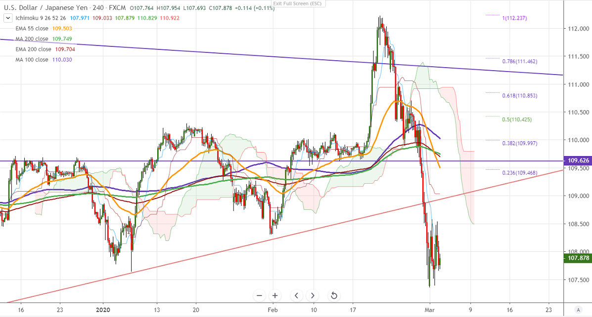 USDJPY has almost formed a double top around 108.60 and started to decline. The overall trend is still weak due to the outbreak of coronavirus. The US has confirmed 4 more death in Seattle and the total in the US rose to 6. The total number of infected persons in South Korea crossed 4800, global surged 90000. The pair hits an intraday low of 107.66 and is currently trading around 107.86.