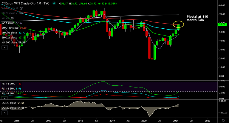 Prices have approached stiff resistance at 110 month EMA at 58.65. Decisive break above will ignite further gains. Scope for test of 200 month MA at 69.52.
