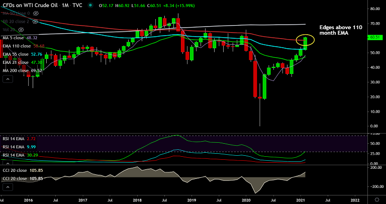 Price action has edged above crucial 110 month EMA resistance. Gains till 69.52 (200 month MA) look likely.