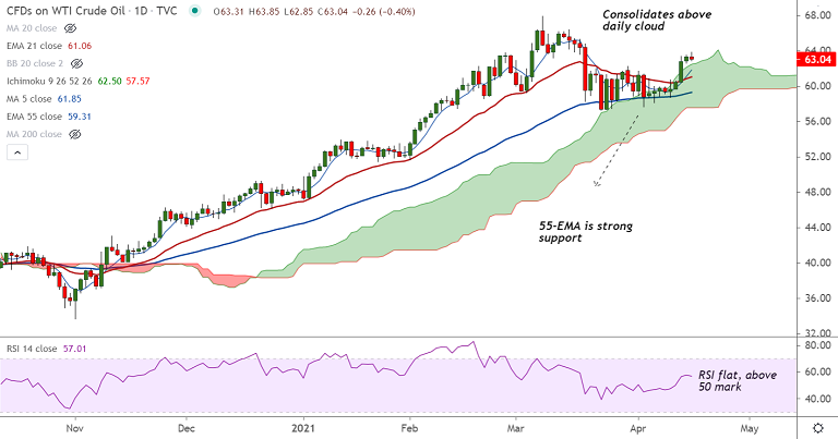 Pullback in oil prices have held support at daily cloud and are showing signs of upside resumption.