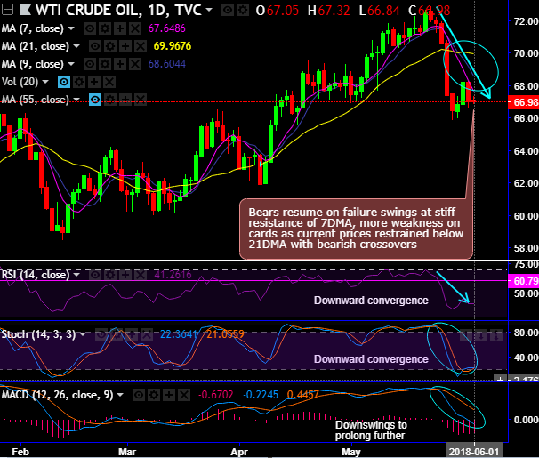 Both leading oscillators (RSI & stochastic curves) have been bearish bias by showing downward convergence on daily terms, whereas overbought pressures are popping up. While bearish DMA and MACD crossovers indicate downside is likely to prolong further.
