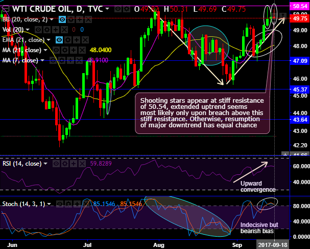 WTI crude prices have plummeted recent upswings, after rejecting stiff resistance level, although prices today have spiked upto 50.31, the bulls could not sustain the momentum in these price gains.
