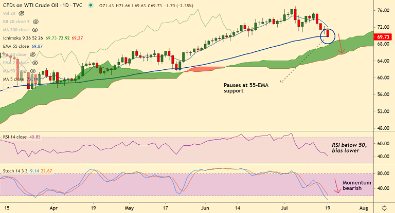 Price action is hovering around 55-EMA support, break below finds next major support at daily cloud at 67.73.