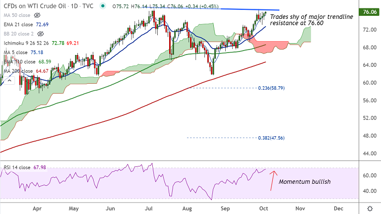 Major resistance is seen at 76.60 (Trendline). Decisive break above will propel the pair higher. 5-DMA is immediate support, break below will see dip till 21-EMA at 72.68.