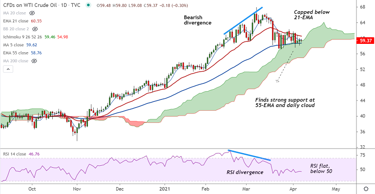 US oil fails to garner upside momentum, upside remains capped at 21-EMA resistance. Price action remains sandwiched between 21 and 55 EMAs. Breakout will provide a clear directional bias.